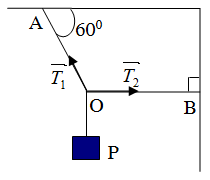Một vật có trọng lượng P đứng cân bằng nhờ hai dây OA làm với trần một góc 600 và OB nằm ngang. Tính độ lớn lực căng của dây OA và độ lớn lực căng của dây OB.