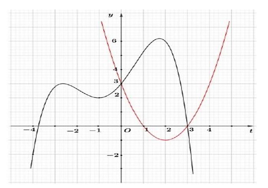 Vẽ đồ thị hàm số \(y = f'\left( t \right)\) và đồ thị hàm số \(y = {t^2} - 4t + 3\) trên cùng hệ trục tọa độ ta được: