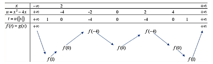 Đặt \(t = u\left( {\left| x \right|} \right) = {\left| x \right|^2} - 4\left| x \right|\).