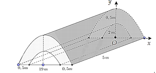 Ta có thể tích của bê tông là: \[V = 5 \cdot 2\left[ {\int_0^{10} {\left( { - \frac{1}{{40}}{x^2} + \frac{5}{2}} \right)} \,{\rm{d}}x - \int_0^{\frac{{19}}{2}} {\left( { - \frac{8}{{361}}{x^2} + 2} \right)} \,{\rm{d}}x} \right] = 40\,\,{{\rm{m}}^3}\].