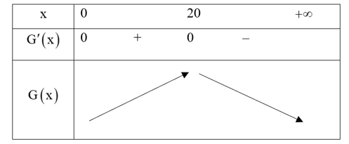 Ta có: \(G'\left( x \right) = 1,44x - 0,072{x^2}\)\( \Rightarrow G'\left( x \right) = 0 \Leftrightarrow \left[ {\begin{array}{*{20}{l}}{x = 0}\\{x = 20}\end{array}.} \right.\)