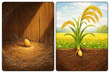 Thời gian trôi qua, hạt lúa thứ nhất bị héo khô nơi góc nhà vì nó chẳng nhận được nước và ánh sáng. Lúc này chất dinh dưỡng chẳng giúp ích được gì - nó chết dần chết mòn. Trong khi đó, hạt lúa thứ hai dù nát tan trong đất nhưng từ thân nó lại mọc lên cây lúa xanh tươi, trĩu hạt vàng óng. Nó mang đến cuộc đời những hạt lúa mới…