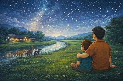 - Ở nhà, chúng ta chỉ có một con chó, còn mọi người ở đây thì có tới bốn. Chúng ta chỉ có một hồ bơi trong vườn, còn họ có cả một dòng sông. Chúng ta thắp sáng bằng những bóng đèn điện, còn họ đêm đến lại có rất nhiều ngôi sao tỏa sáng. Nhà mình có những cửa sổ nhưng họ có cả một bầu trời bao la. Cảm ơn cha đã cho con thấy cuộc sống bên ngoài rộng mở và đẹp làm sao!