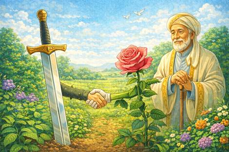 Thanh kiếm và hoa hồng hiểu ra, chúng rối rít cảm ơn nhà thông thái. Cả hai bắt tay nhau thân thiện và không bao giờ cãi nhau nữa.