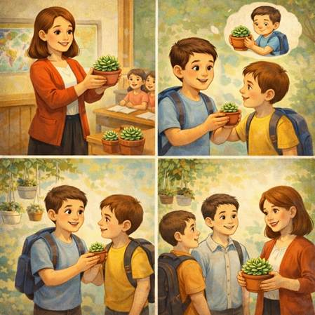 Cô giáo lớp bốn làm cả lớp Lân ngạc nhiên vì cô mang đến lớp một chậu sen đá – loại cây có thể sinh nhiều cây con từ một thân mẹ. Cô nói với học sinh: