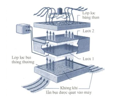 Sơ đồ của máy lọc bụi được trình bày bên hình dưới đây. Không khí có nhiều bụi, được hút vào máy qua lớp lọc bụi thông thường. Tại đây, các hạt bụi có kích thước lớn bị gạt lại. Dòng không khí có lẫn các hạt bụi có kích thước nhỏ vẫn bay lên. Hai lưới 1 và 2 thực chất là 2 điện cực: lưới 1 là điện cực dương, lưới 2 là điện cực âm. Khi bay qua lưới 1, các hạt bụi nhiễm điện dương. Do đó khi gặp lưới 2 nhiễm điện âm, các hạt bụi bị hút vào lưới. Vì vậy qua lưới 2 không khí đã được lọc sạch bụi. Sau đó có thể cho không khí đi qua lớp lọc bằng thanh để khử mùi. Bằng cách này có thể lọc đến 95% bụi trong không khí