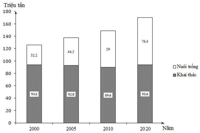 Cơ cấu sản lượng thủy sản khai thác và nuôi trồng của thế giới.