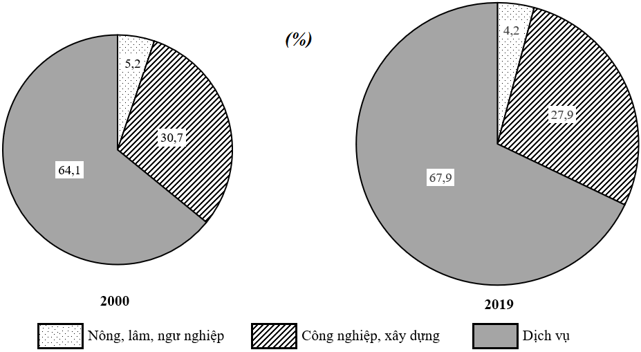 Theo biểu đồ, cho biết nhận định nào sau đây không đúng với cơ cấu GDP thế giới phân theo ngành kinh tế năm 2000 và năm 2019?