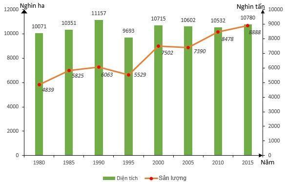 Cho biểu đồ về diện tích và sản lượng cà phê trên thế giới qua các năm