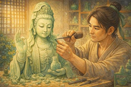 Một hôm có người mang một khối ngọc thạch đến và nhờ anh tạc cho một pho tượng Quan Âm. Trương Bạch tự nhủ sẽ gắng công tạo nên một tác phẩm tuyệt trần, mĩ mãn.