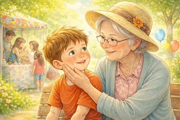 Trong một góc công viên, rất nhiều trẻ con đang xếp hàng chờ được một họa sĩ trang trí lên mặt để trở thành những “người da đỏ” hay “người ngoài hành tinh” ... Một cậu bé cũng nắm tay bà chờ đến lượt mình. Mặt cậu bé có rất nhiều đốm tàn nhang nhỏ, nhưng đôi mắt thì sáng lên vì háo hức. – Cậu lắm tàn nhang thế, làm gì có chỗ nào trên mặt mà vẽ ! – Cô bé xếp hàng sau cậu bé nói to.