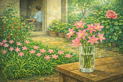 Mùa hè, tôi thường đến nhà thầy, đúng mùa hoa tóc tiên. Sáng sáng hoa tóc tiên đua nhau nở rộ như đua nhau khoe màu, biến đường viền xanh thành đường viền hồng cánh sen. Cầm một bông tóc tiên thường là năm cánh, mỏng như lụa, còn mát sương đêm, sẽ thấy mùi hương ngòn ngọt và thơm thơm của phong bánh đậu Hải Dương, muốn ăn ngay.