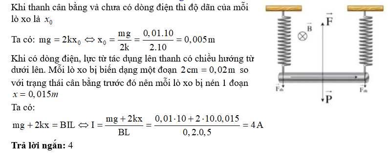 d) Sai. \(IBl = \Delta mg \Rightarrow B = \frac{{\Delta mg}}{{Il}} = \frac{{(102,48 - 101,09) \cdot {{10}^{ - 3}} \cdot 9,81}}{{4.0,1}} \approx 0,034T\)