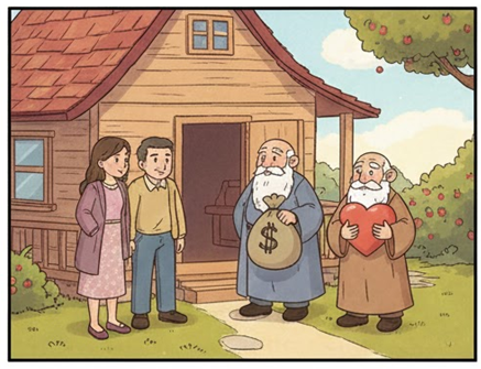 Hai người cùng nhau trả lời: “Nếu bà mời ngài Giàu sang hoặc Thành Công thì chỉ có một người khách được mời vào. Nhưng vì bà mời Tình Yêu nên cả ba chúng tôi đều vào. Bởi vì ở đâu có Tình Yêu thì ở đó sẽ có Thành Công và Giàu Sang”.
