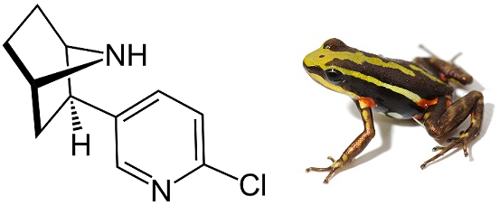 Epibatidine, một loại dầu không màu được phân lập từ da của loài ếch mũi tên độc Equadorian Epipedobates ba màu. Đây là hợp chất có tác dụng giảm đau gấp vài lần morphine, nhưng lại không gây nghiện. Cấu trúc hóa học của epibatidine mô tả như hình dưới: