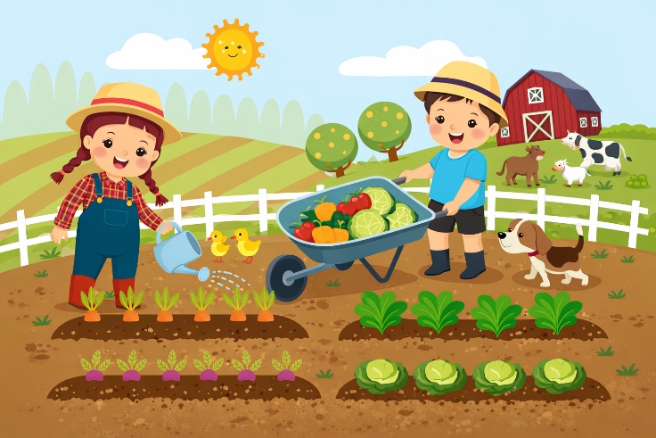 - Sáng sớm, hai bạn nhỏ đã ra vườn tưới rau.