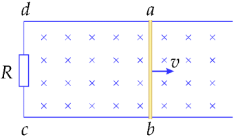 Như hình bên, thanh dây dẫn ab có điện trở Rab = 0,1Ω chuyển động với tốc độ không đổi sang phải dọc theo khung dây nhẵn, khung dây được nối với điện trở R = 0,4Ω. Tất cả được đặt trong từ trường đều có cảm ứng từ B = 0,1T và đường sức hướng vuông góc với mặt phẳng khung dây.