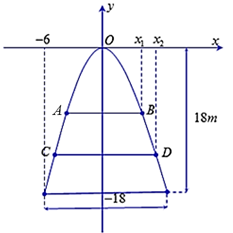 Một cổng chào có dạng hình Parabol chiều cao 18 m, chiều rộng tại chân cổng 12 m như hình vẽ bên. Người ta căng hai sợi dây trang trí AB, CD nằm ngang đồng thời chia hình giới hạn bởi Parabol và mặt đất thành ba phần có diện tích bằng nhau. Tỉ số \(\frac{{AB}}{{CD}}\) bằng bao nhiêu (nhập đáp án vào ô trống, làm tròn kết quả đến hàng phần mười)?