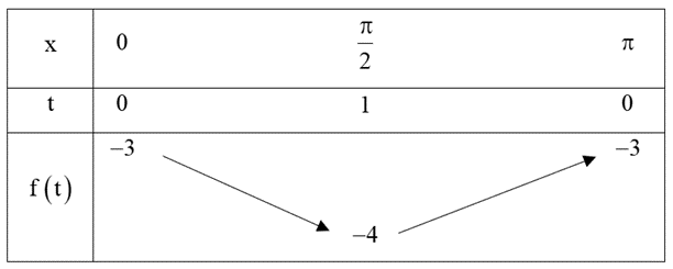 Căn cứ vào bảng biến thiên, ta thấy phương trình \[f\left( {\sin x} \right) = m\] có đúng hai nghiệm trên đoạn \[\left[ {0\,;\,\,\pi } \right]\] khi và chỉ khi \( - 4 < m \le  - 3\), tức là \(m \in \left( { - 4; - 3} \right]\). Khi đó, \(a =  - 4;b =  - 3\).