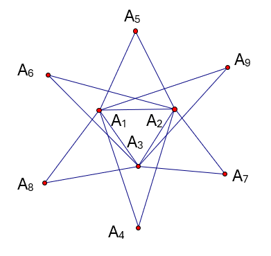 Vậy \[M\] chứa ít nhất là 9 điểm. Dấu bằng xảy ra với hình dưới.