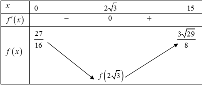 Xét hàm số \(f\left( x \right) = \frac{{\sqrt {{x^2} + 36} }}{8} + \frac{{15 - x}}{{16}}\),\(0 \le x \le 15\), ta có \(f'\left( x \right) = \frac{x}{{8\sqrt {{x^2} + 36} }} - \frac{1}{{16}}\).