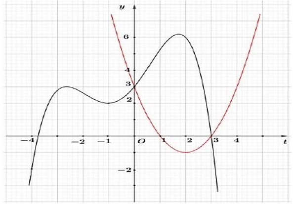 Vẽ đồ thị hàm số \(y = f'\left( t \right)\) và đồ thị hàm số \(y = {t^2} - 4t + 3\) trên cùng hệ trục tọa độ ta được: