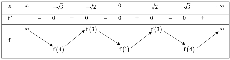 Khi đó \(f'\left( {{x^2} + 1} \right) = 0 \Leftrightarrow \left[ {\begin{array}{*{20}{l}}{{x^2} + 1 = 1}\\{{x^2} + 1 = 3}\\{{x^2} + 1 = 4}\end{array} \Leftrightarrow \left[ {\begin{array}{*{20}{l}}{{x^2} = 0}\\{{x^2} = 2}\\{{x^2} = 3}\end{array} \Leftrightarrow \left[ {\begin{array}{*{20}{l}}{x = 0}\\{x = \pm \sqrt 2 }\\{x = \pm \sqrt 3 }\end{array}} \right.} \right.} \right.\).