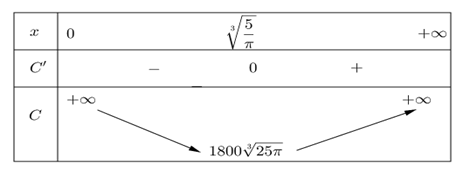 Căn cứ vào bảng biến thiên, ta có: \(\mathop {\min }\limits_{\left( {0; + \infty } \right)} C = 1800\sqrt[3]{{25\pi }} \Leftrightarrow R = \sqrt[3]{{\frac{5}{\pi }}}\).