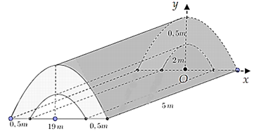 Ta có thể tích của bê tông là: \[V = 5 \cdot 2\left[ {\int_0^{10} {\left( { - \frac{1}{{40}}{x^2} + \frac{5}{2}} \right)} \,{\rm{d}}x - \int_0^{\frac{{19}}{2}} {\left( { - \frac{8}{{361}}{x^2} + 2} \right)} \,{\rm{d}}x} \right] = 40\,\,{{\rm{m}}^3}\].
