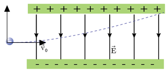 Một electron chuyển động với tốc độ ban đầu v0 = 1,6.106(m) bay vào vùng điện trường đều theo phương song song với hai bản và ở ngay giữa hai bản như hình vẽ. Biết chiều dài mỗi bản là 3 cm và khoảng cách giữa hai bản là 1(cm). Giữa hai bản có điện trường hướng từ trên xuống, điện trường bên ngoài hai bản bằng 0. Xét trường hợp electron di chuyển đến vị trí mép ngoài của tấm bản phía trên, tính độ lớn cường độ điện trường giữa hai bản.