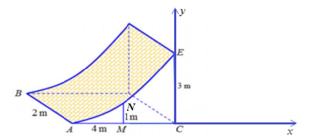 Do cạnh cong \(AE\) nằm trên một đường Parabol nên phương trình cạnh cong \(AE\) có dạng \(y = a{x^2} + bx + c\). Cạnh \(AE\) đi qua các điểm \(A\left( { - 4;0} \right);E\left( {0;3} \right);N\left( { - 2;1} \right)\) nên ta có hệ phương trình:
