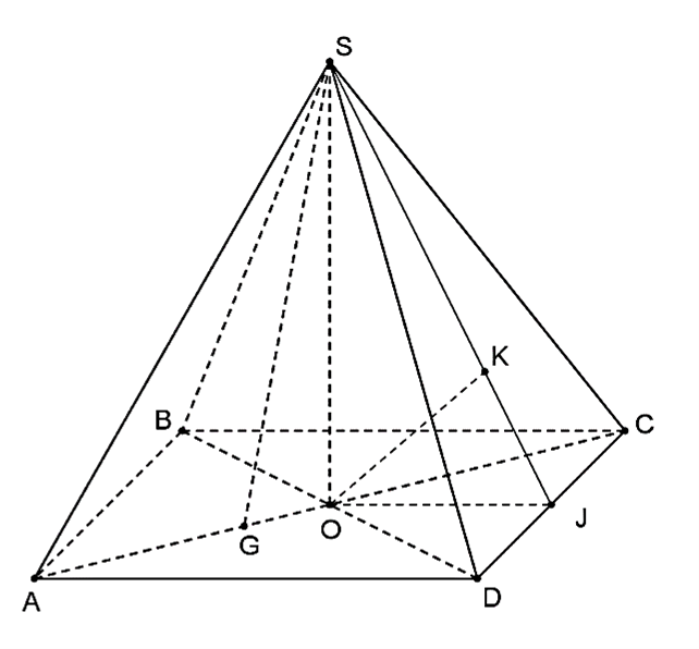 Gọi \(O = AC \cap BD\). \(J\) là trung điểm của \(CD\). Gọi \(K\) là hình chiếu của \(O\) lên \(SJ\)