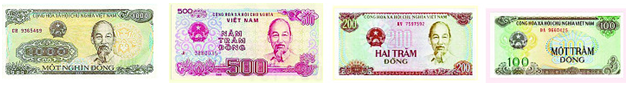 4 tờ tiền đã cho có giá trị 100 đồng, 200 đồng, 500 đồng, 1000 đồng.