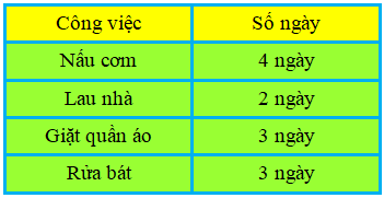Cho biết lịch làm việc nhà hằng tuần của Nam như sau: