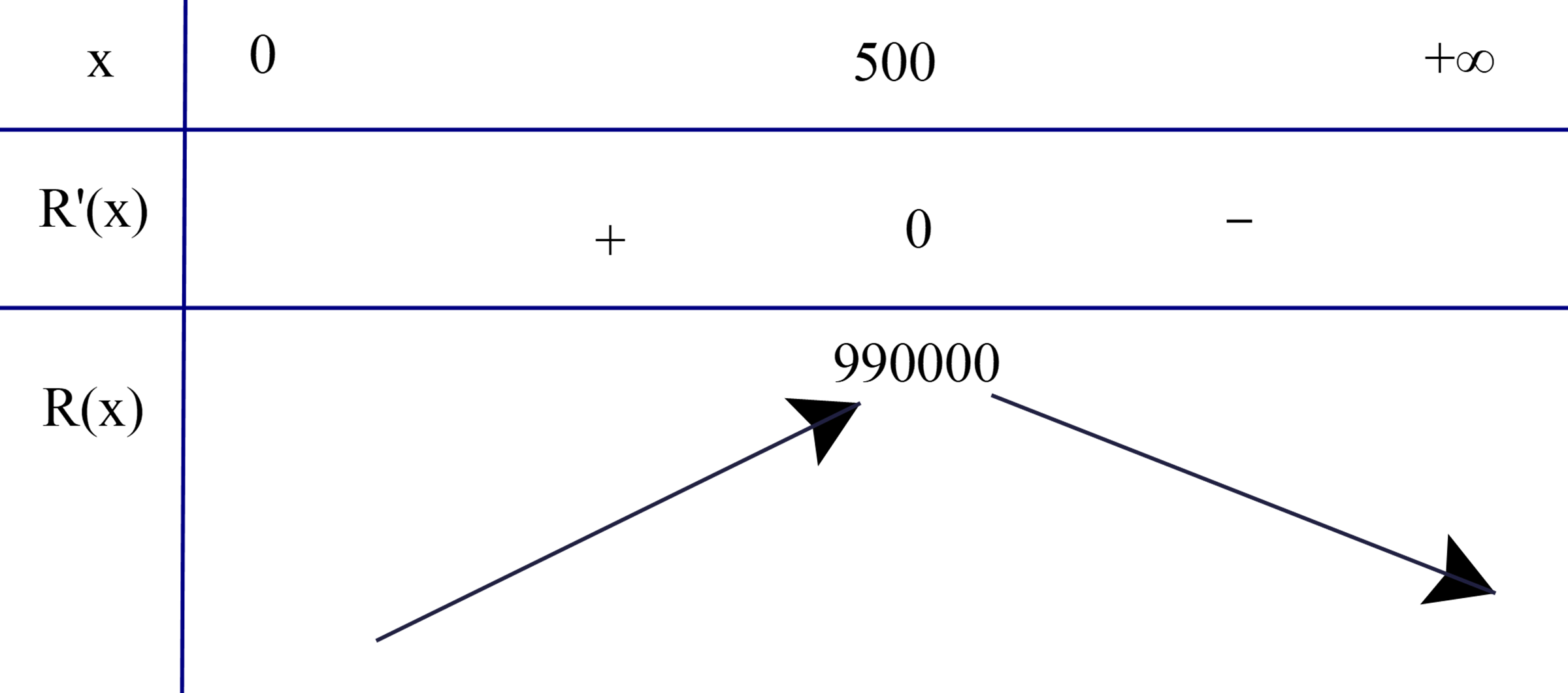 Ta có \(R'\left( x \right) = - 0,012{x^2} + 3000 = 0 \Rightarrow x = 500\) (vì \(x > 0\)).