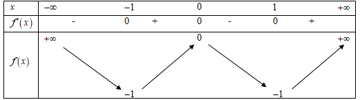 Ta có \(f'\left( x \right) = 4{x^3} - 4x = 0 \Rightarrow \left[ {\begin{array}{*{20}{l}}{x = 0}\\{x = \pm 1}\end{array}} \right.\)