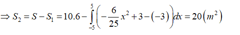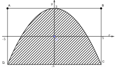 Parabol có đỉnh \(I\left( {0;3} \right)\), đi qua các điểm \(D\left( { - 5; - 3} \right),C\left( {5; - 3} \right) \Rightarrow \) Phương trình \(\left( P \right):y = \frac{{ - 6}}{{25}}{x^2} + 3\)