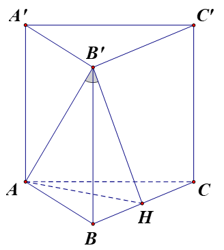Khi đó \(AH = \frac{{a\sqrt 3 }}{2}\) và \(AH \bot \left( {BCC'B'} \right)\) nên góc giữa \(AB'\) và \(\left( {BCC'B} \right)\) là \(\widehat {AB'H} = 30^\circ \).