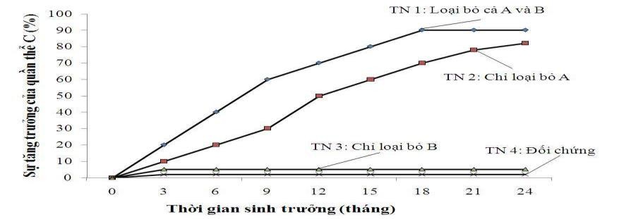 a) Sai. Ở thí nghiệm 2, khi loại bỏ 1 mình loài A, quần thể C vẫn phát triển nhưng không mạnh như khi loại bỏ cả 2 loài. Mặt khác, ở thí nghiệm 3, khi loại bỏ loài B thì sự sinh trưởng và phát triển của loài C bị ảnh hưởng rất lớn, sự phục hồi của quần thể loài C gần như không diễn ra. Điều này có thể khẳng định, loài A là yếu tố sinh học ức chế sự sinh trưởng và phát triển của loài C (loài A ức chế cảm nhiễm loài C).