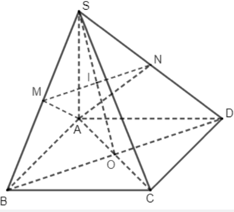 Gọi \(I=SO∩MN⇒I\) là trung điểm của \(MN,SO⇒AI⊥MN\).
