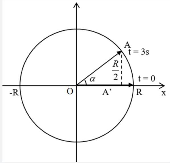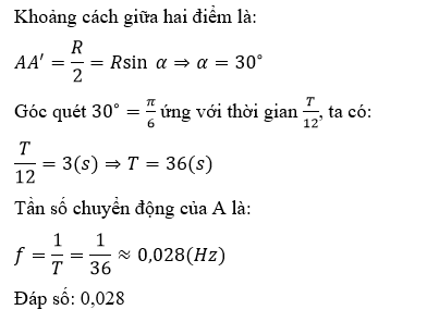 Trên thực tế, sau khi đạn va chạm với vật, đạn sẽ dính vào trong vật và sau đó chúng sẽ thực hiện một dao động điều hòa (bỏ qua mọi ma sát). Mỗi dao động điều hòa lại có thể coi là hình chiếu của 1 chuyển động tròn đều lên phương đường kính. Cho chất điểm A chuyển động tròn đều trên đường tròn bán kính R . Gọi A^' là hình chiếu của A trên một đường kính của đường tròn này. Tại thời điểm t=0 ta thấy hai điểm này gặp nhau, đến thời điểm t^'=3" " s ngay sau đó khoảng cách giữa chúng bằng một nửa bán kính. Tần số của chuyển động tròn đều của A là ______ Hz.