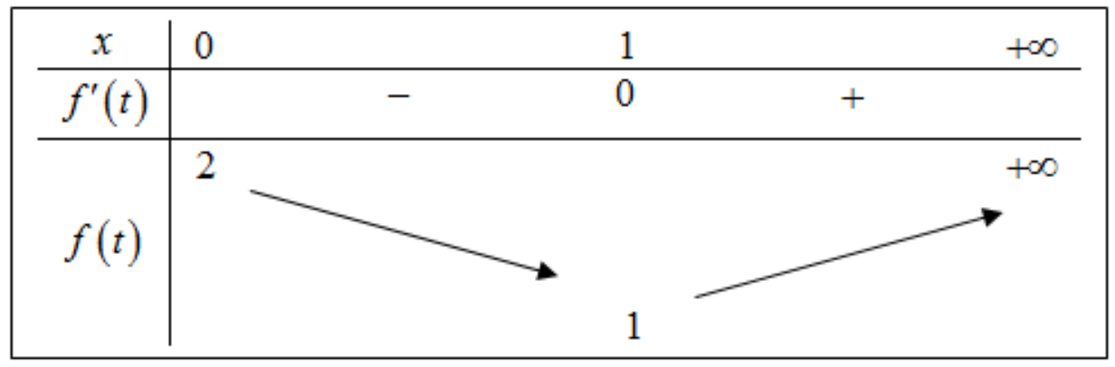 Xét hàm số \(f\left( t \right) = \frac{{{t^2} - t + 2}}{{t + 1}}\) trên khoảng \(\left( {0; + \infty } \right)\),