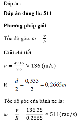 Hiện nay, tốc độ lớn nhất có thể đạt được của siêu xe Bugatti Chiron là 490,5 km/h (tức là xấp xỉ một chiếc tàu đệm từ). Giả sử chiếc siêu xe này sử dụng bộ mâm có đường kính là 21 inch (tức là 53,3 cm ), hỏi rằng khi nó đạt tốc độ tối đa là 490,5 km/h thì bánh xe quay với tốc độ góc bao nhiêu?
