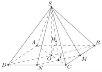 Gọi \(N\) là trung điểm của \(CD,I\) là giao điểm của \(MN\) và \(OC. \Rightarrow \left( {SMN} \right) \bot \left( {SOI} \right)\).