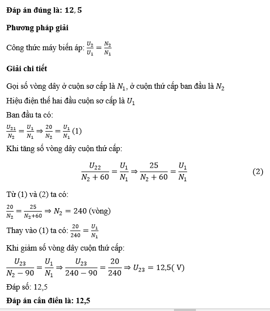 Khi đặt một điện áp xoay chiều có giá trị hiệu dụng không đổi vào hai đầu cuộn sơ cấp thì điện áp thứ cấp là 20V. Khi tăng số vòng dây cuốn cuộn thứ cấp 60 vòng thì điện áp hiệu dụng hai đầu cuộn thứ cấp để hở là 25V. Khi giảm số vòng dây thứ cấp 90 vòng thì điện áp hiệu dụng hai thứ cấp để hở là _____