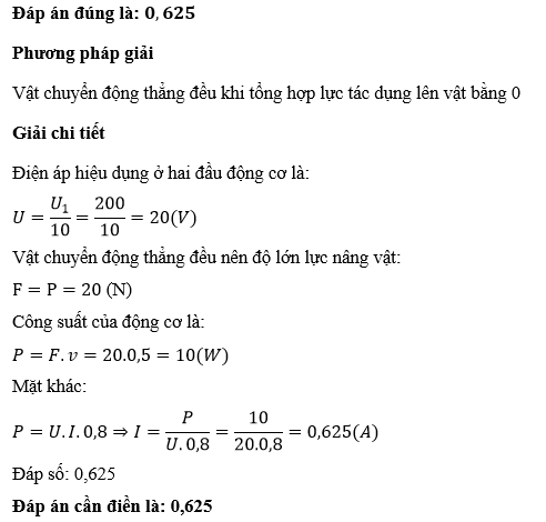 Đặt một điện áp xoay chiều có giá trị hiệu dụng 200V vào hai đầu cuộn sơ cấp của máy biến áp lý tưởng, rồi mắc 2 đầu của cuộn thứ cấp với một động cơ điện. Động cơ này nâng một vật có trọng lượng 20N với vận tốc không đổi là 0,5 m/s. Cho rằng không có sự mất mát năng lượng vì tỏa nhiệt ở các dây nối và động cơ. Biết máy biến áp này có tác dụng giảm áp 10 lần và công suất điện mà động cơ tiêu thụ được tính bằng công thức P= U.I.0,8 (với U và I là điện áp hiệu dụng và cường độ dòng điện hiệu dụng chạy qua động cơ). Khi đó, cường độ dòng điện chạy qua cuộn thứ cấp có giá trị hiệu dụng là ______ A.