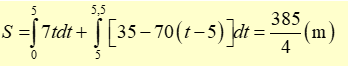 Một ô tô bắt đầu chuyển động nhanh dần đều với vận tốc . Đi được 5s, người lái xe phát hiện chướng ngại vật và phanh gấp, ô tô tiếp tục chuyển động chậm dần đều với gia tốc . Tính quãng đường S đi được của ô tô từ lúc bắt đầu chuyển bánh cho đến khi dừng hẳn (nhập đáp án vào ô trống).