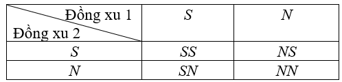 Gieo hai đồng xu cân đối, đồng chất một lần. Kí hiệu \(S,N\) lần lượt chỉ đồng cu lật sập, lật ngửa. Các kết quả có thể xảy ra là