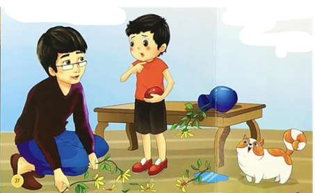 Nhà bé Minh Quân có một chú Mèo vàng rất ngoan. Minh Quân yêu nó lắm. Ngày chủ nhật bố mẹ vắng nhà. Bé Minh Quân và Mèo vàng được dịp nô đùa thỏa thích, mải đùa nghịch, chẳng may tay Minh Quân gạt phải lo hoa, lọ hoa rơi xuống vỡ tan tành. Chiều bố mẹ về Minh Quân mách: