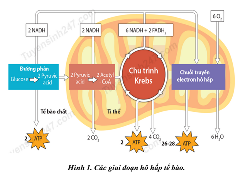Dựa vào Hình 1, khí CO₂ trong quá trình hô hấp tế bào được giải phóng ở các giai đoạn nào?